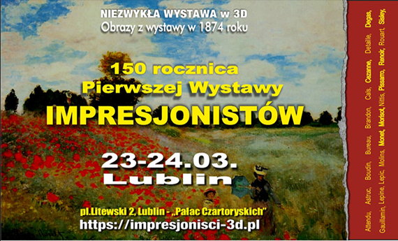 Pałac Czartoryskich otworzy swoje drzwi w ramach wystawy, mającej na celu upamiętnienie Pierwszej Wystawy Impresjonistów z 1874 roku. Obrazy największych mistrzów będzie można odkryć na nowo za pomocą techniki 3D Anaglif Red/ Cyjan. Więcej informacji na facebook.com ...