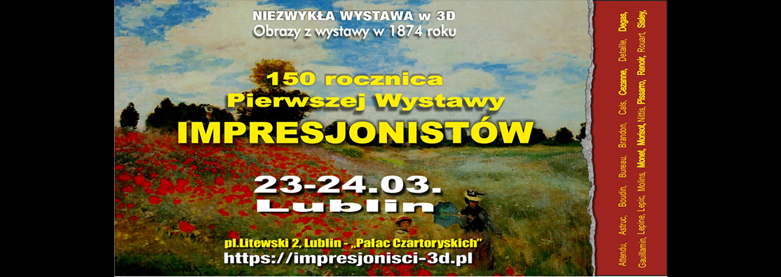 Pałac Czartoryskich otworzy swoje drzwi w ramach wystawy, mającej na celu upamiętnienie Pierwszej Wystawy Impresjonistów z 1874 roku. Obrazy największych mistrzów będzie można odkryć na nowo za pomocą techniki 3D Anaglif Red/ Cyjan.
