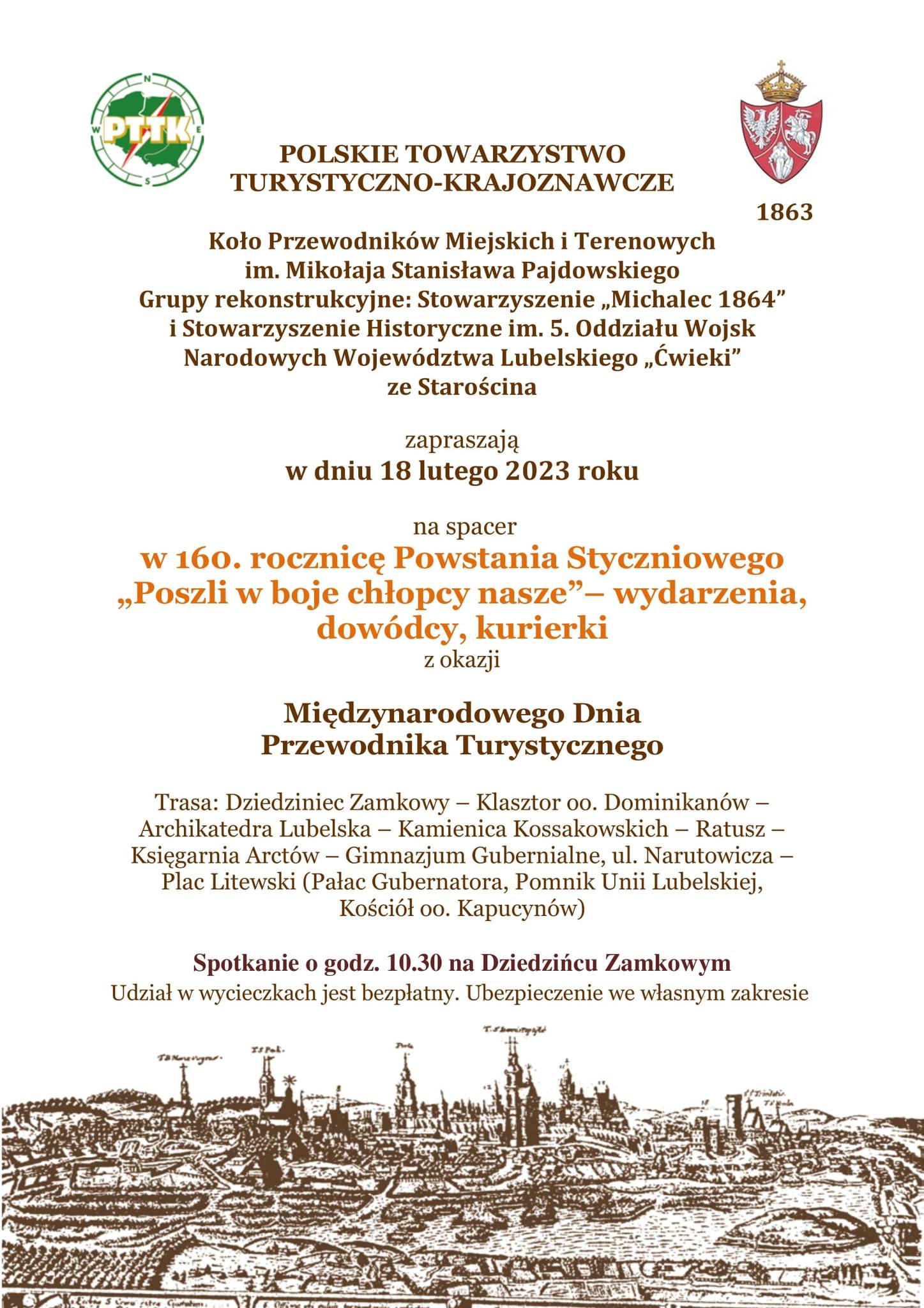 Odkryj miejsca związane z Powstaniem Styczniowym w Lublinie. Przewodnicy PTTK oraz członkowie grup rekonstrukcyjnych zapraszają na bezpłatny spacer w 160. rocznicę Powstania Styczniowego ''Poszli w boje chłopcy nasze'' - wydarzenia, dowódcy, kurierki.