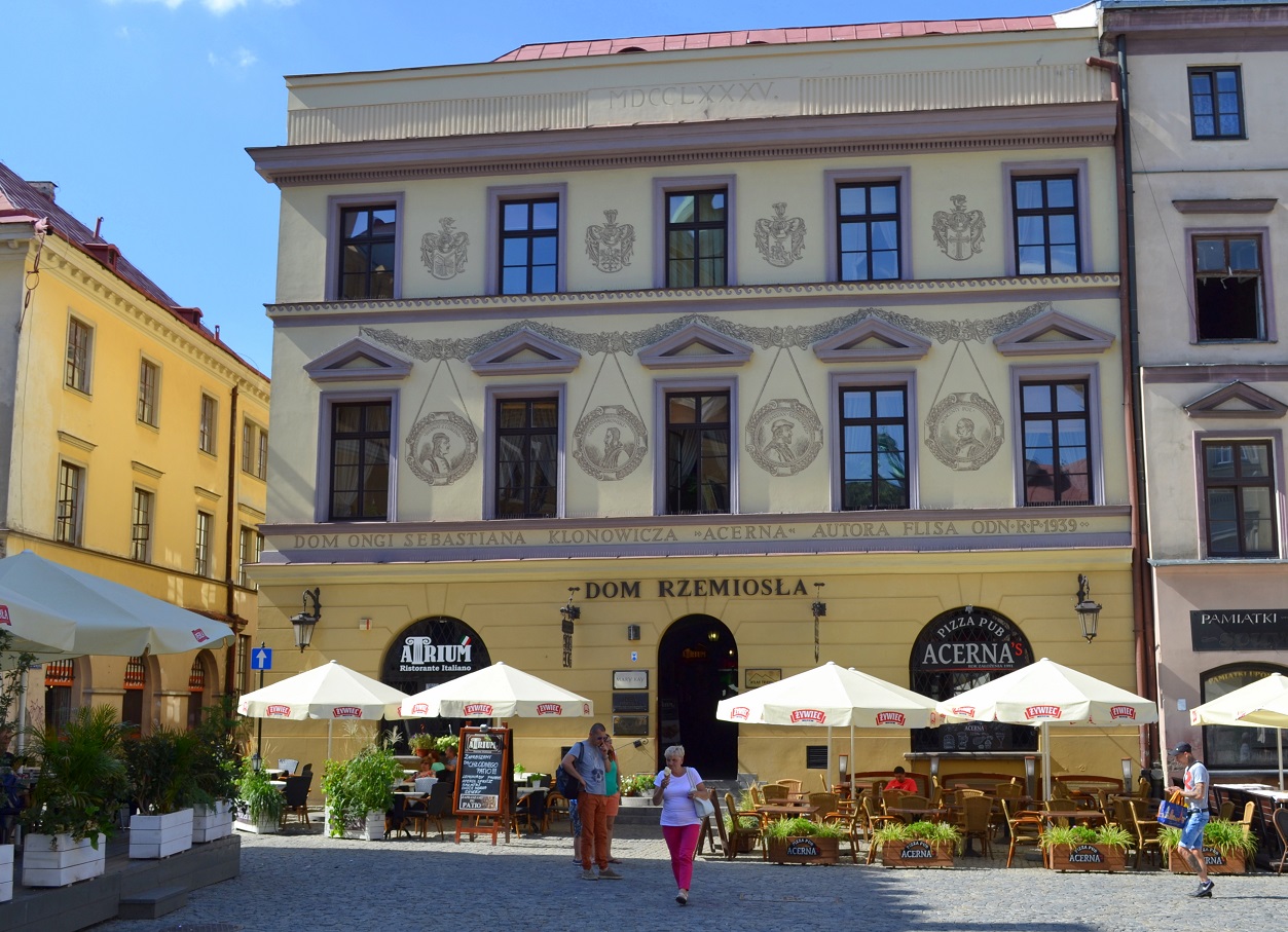 Charakterystyczna, potężna kamienica stojąca na rogu Rynku i ulicy Olejnej nazywana jest kamienicą Klonowica. Na początku XVI wieku, stały tu dwie kamienice należące do rodzin Jaczmirskich i Łabędziów. Jan Łabędź w 1538 roku został właścicielem obu kamienic, które sprzedał Stanisławowi Wiślickiemu w roku 1545. Kamienicę po lewej stronie odziedziczył po ojcu Jan Wiślicki, ławnik lubelski, przyszły teść Sebastiana Klonowica. Prawa kamienica ponownie trafiła w ręce rodziny Łabędziów, nabył ją Maciej, syn Jana. Ciekawostką jest fakt iż 22 sierpnia 1584 roku w tej kamienicy zmarł Jan Kochanowski. Kamienice jeszcze wiele razy zmieniały właścicieli, którymi były m.in. rodziny Sługockich, Oczków, Krokierów, Hendrichów, Heysslerów. W XVIII wieku kamienice zostały przebudowane i połączone w jedną całość. Wówczas kamienica otrzymała szatę klasycystyczną z pięciookienną fasadą, szeroką sienią i arkadowym dziedzińcem. Na murze attykowym wieńczącym fasadę została umieszczona data przebudowy „1785”. Podczas remontu w 1939 roku, artysta Jan Wodyński wykonał charakterystyczne sgraffitowe medaliony z portretami literatów związanych z Lublinem – Biernata z Lublina, Sebastiana Klonowica, Jana Kochanowskiego i Wincentego Pola.
