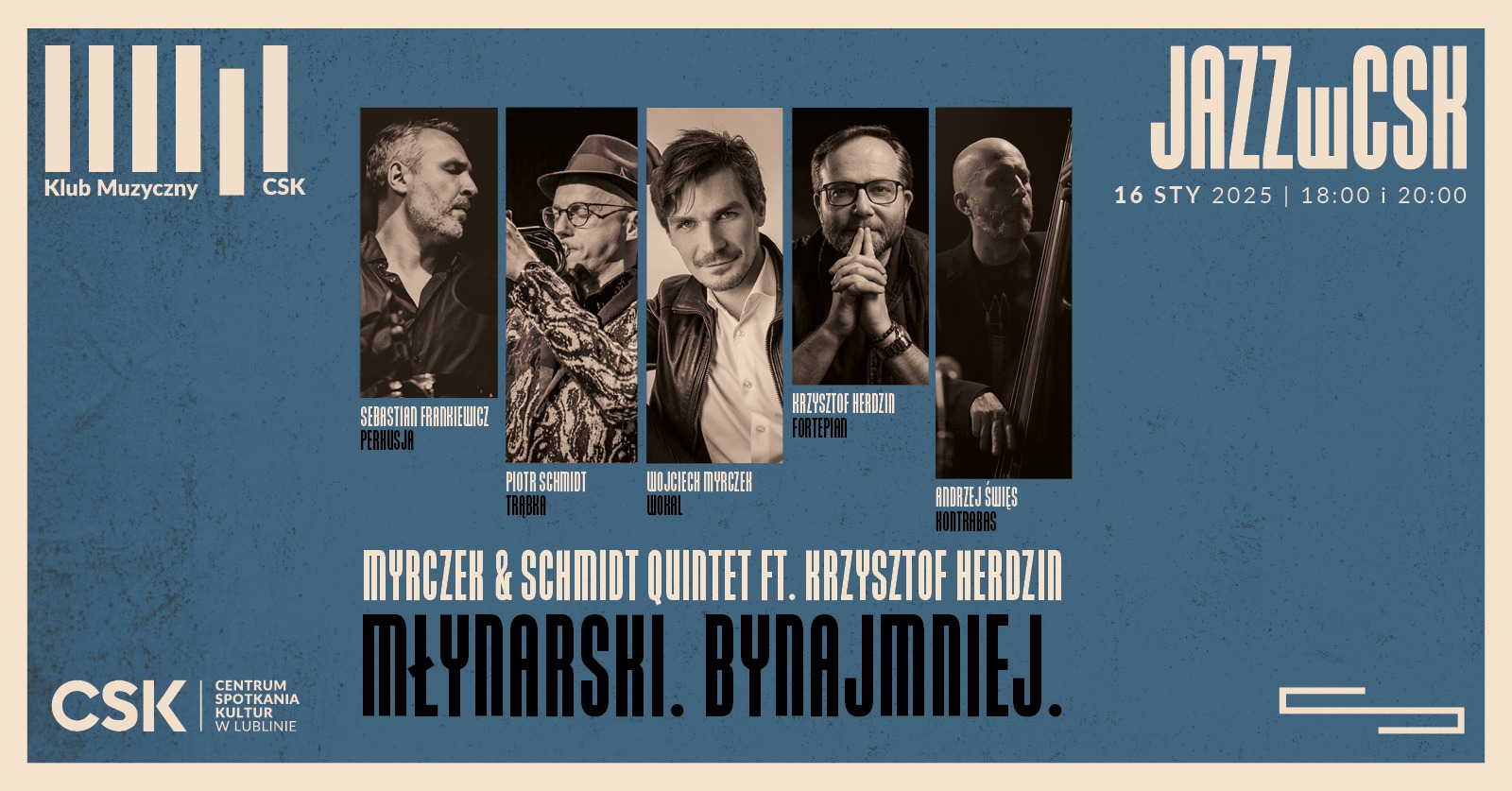 „Młynarski. Bynajmniej.” to projekt muzyczny z jazzowymi aranżacjami Krzysztofa Herdzina i Sabiny Meck do tekstów Wojciecha Młynarskiego, którego premiera odbyła się 4 grudnia 2024 roku. Liderzy Piotr Schmidt, Wojciech Myrczek i Krzysztof Herdzin gwarantują najwyższą jakość muzyczną i niezapomniane wrażenia. Koncert odbędzie się 16 stycznia o godz. 18.00 i 20.00 w Klubie Muzycznym CSK.