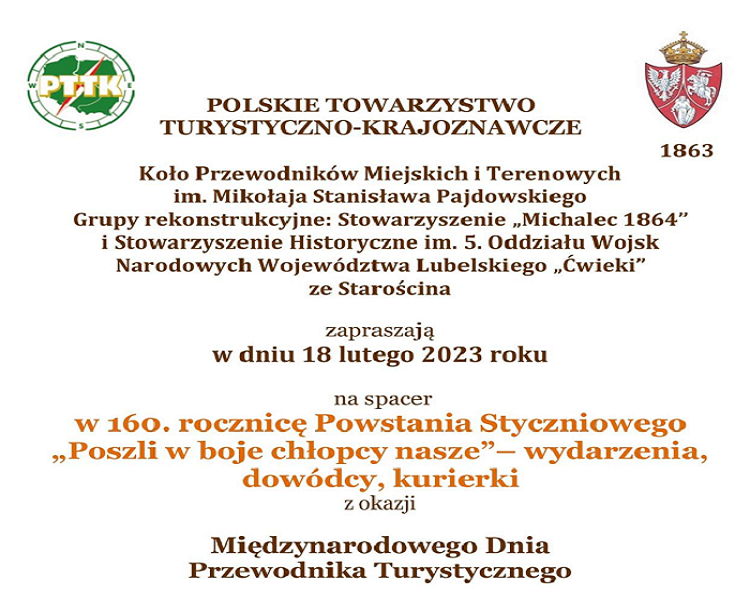 Odkryj miejsca związane z Powstaniem Styczniowym w Lublinie. Przewodnicy PTTK oraz członkowie grup rekonstrukcyjnych zapraszają na bezpłatny spacer w 160. rocznicę Powstania Styczniowego ''Poszli w boje chłopcy nasze'' - wydarzenia, dowódcy, kurierki. Spacer jest organizowany w ramach obchodów Międzynarodowego Dnia Przewodnika Turystycznego. Więcej informacji na przewodnicy.lublin.pttk.pl ...