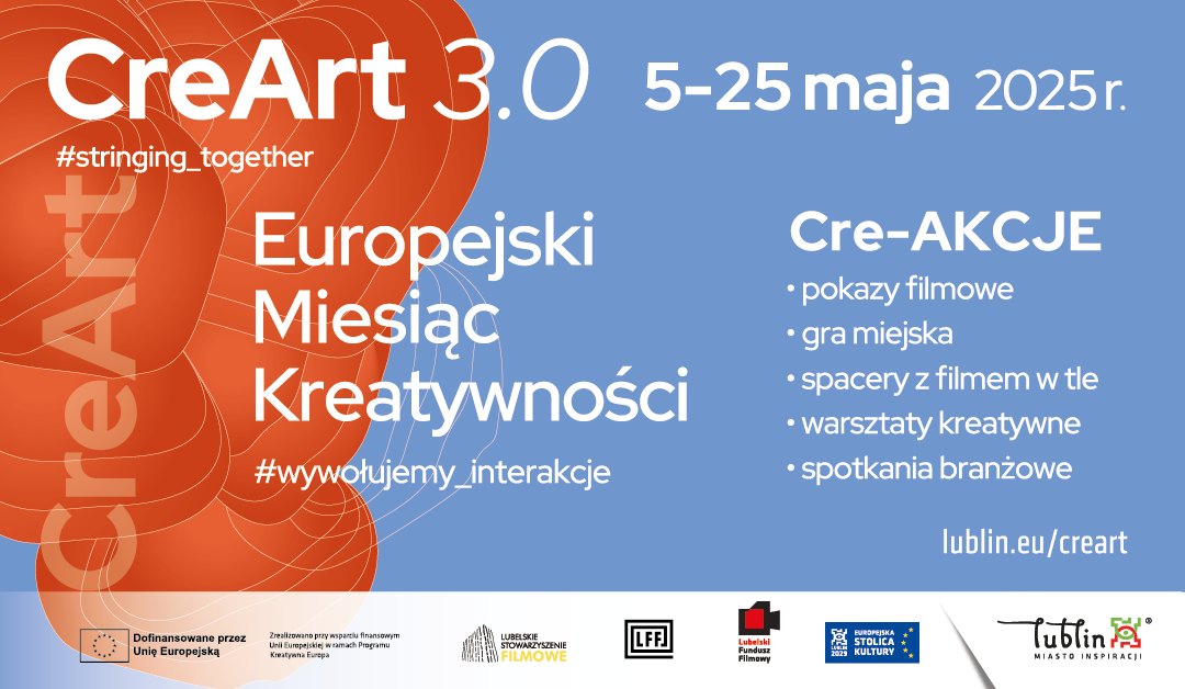 W maju Lublin po raz drugi świętuje Europejski Miesiąc Kreatywności. Hasło przewodnie wydarzenia to #wywołujemy_interakcje, a w jego ramach zaplanowano bezpłatne pokazy filmowe, grę miejską, spacery tematyczne, warsztaty kreatywne oraz spotkania branżowe, skupione wokół lubelskiej branży filmowej. Program podzielono na pięć bloków tematycznych – tzw. Cre-AKCJE – które mają inspirować mieszkańców do twórczego działania i poznawania filmowej historii miasta. Europejski Miesiąc Kreatywności jest częścią międzynarodowego projektu CreArt 3.0 #stringing_together, rea ...
