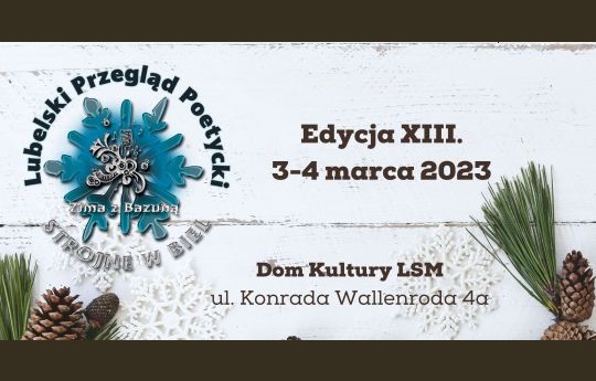 Przed nami kolejna edycja festiwalu "Strojne w biel" - w wersji kameralnej i jednodniowej. W edycji 13. usłyszymy m.in. Jacka Kadisa, Monikę Krajewską, Marka Andrzejewskiego czy Michała Wojtusika.Wydarzeniu towarzyszyć będzie wystawa fotografii "Między światłem a cieniem" Agnieszki Szady. Festiwal będzie gościł w budynku Domu Kultury LSM w Lublinie przy ul. Wallenroda, zaś afterparty odbywać się będzie w pubie Jezuicka Kuchnia Klasztorna (ul. Jezuicka 4). Więcej informacji na: strojnewbiel.pl ...