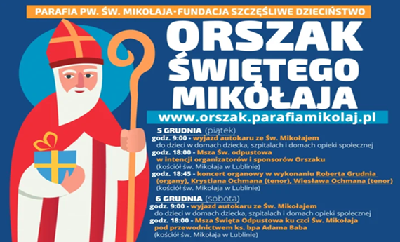 Barwny i radosny Orszak Świętego Mikołaja jak co roku wyruszy ulicami Lublina. Start w niedzielę o 14.00 na Rynku Głównym. W programie m.in. uroczysty przemarsz w kierunku kościoła Św. Mikołaja, gry oraz zabawy, loteria fantowa, czy pokaz sztucznym ogni. Więcej informacji na orszak.parafiamikolaj.pl ...