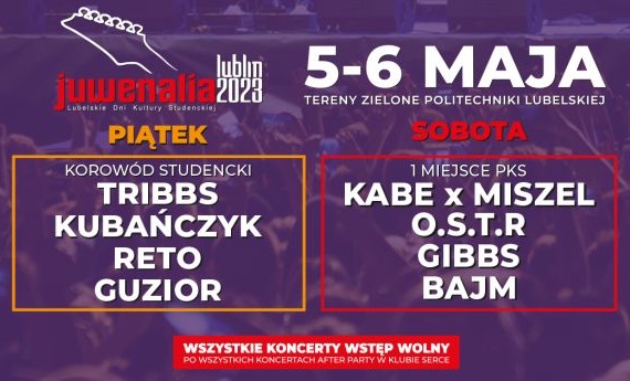 Po dłuższej przerwie wracają Lubelskie Dni Kultury Studenckiej. Impreza rozpocznie się barwnym korowodem. Podczas Juwenaliów nie zabraknie występów muzycznych - dla lubelskiej publiczności zagrają: Tribbs, Kubańczyk, Reto, Guzior, Kabe x Miszel, O.S.T.R., Gibbs, oraz BAJM. Więcej informacji: facebook.com/JuwenaliaPolitechnikiLubelskiej ...
